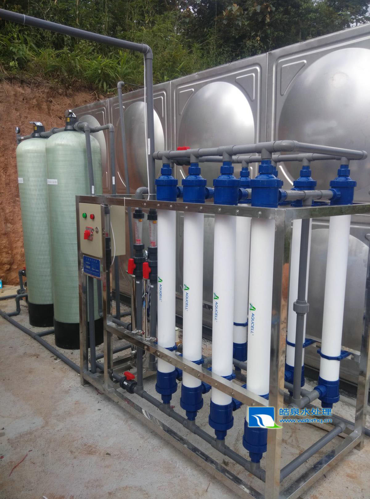 原水箱→原水泵→石英砂過(guò)濾器→活性炭過(guò)濾器→精密過(guò)濾器→超濾設(shè)備→凈水箱