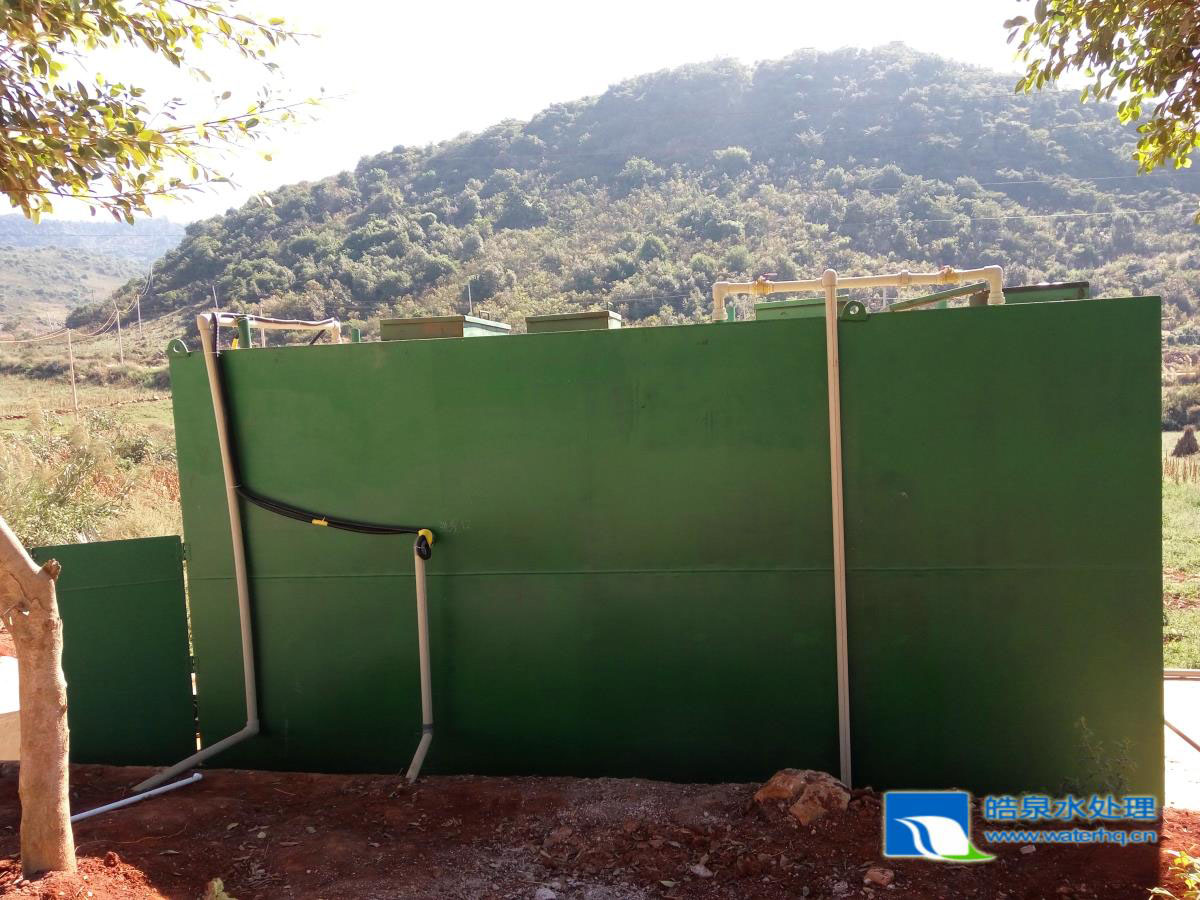 設(shè)備工藝為:污水經(jīng)化糞池熟化后,自流進(jìn)入污水處理站的格柵井,去除顆粒雜物后,流入調(diào)節(jié)池,進(jìn)行均質(zhì)均量,調(diào)節(jié)池中設(shè)置液位控制器,再經(jīng)液位控制儀傳遞信號(hào),由污水泵送至厭氧生物反應(yīng)池,進(jìn)行酸化水解和硝化反硝化,降低有機(jī)物濃度,去除部分氨氮,然后自流至好氧生物反應(yīng)池進(jìn)行好氧生化反應(yīng),在好氧池絕大部分有機(jī)污染物通過(guò)生物氧化、吸附得以降解,出水自流至沉淀池進(jìn)行固液分離,沉淀池上清液流入清水池,在清水池內(nèi)投加次氯酸鈉溶液消毒后由清水泵送至蓄水池儲(chǔ)存,可以用于綠化用水或沖廁用水。