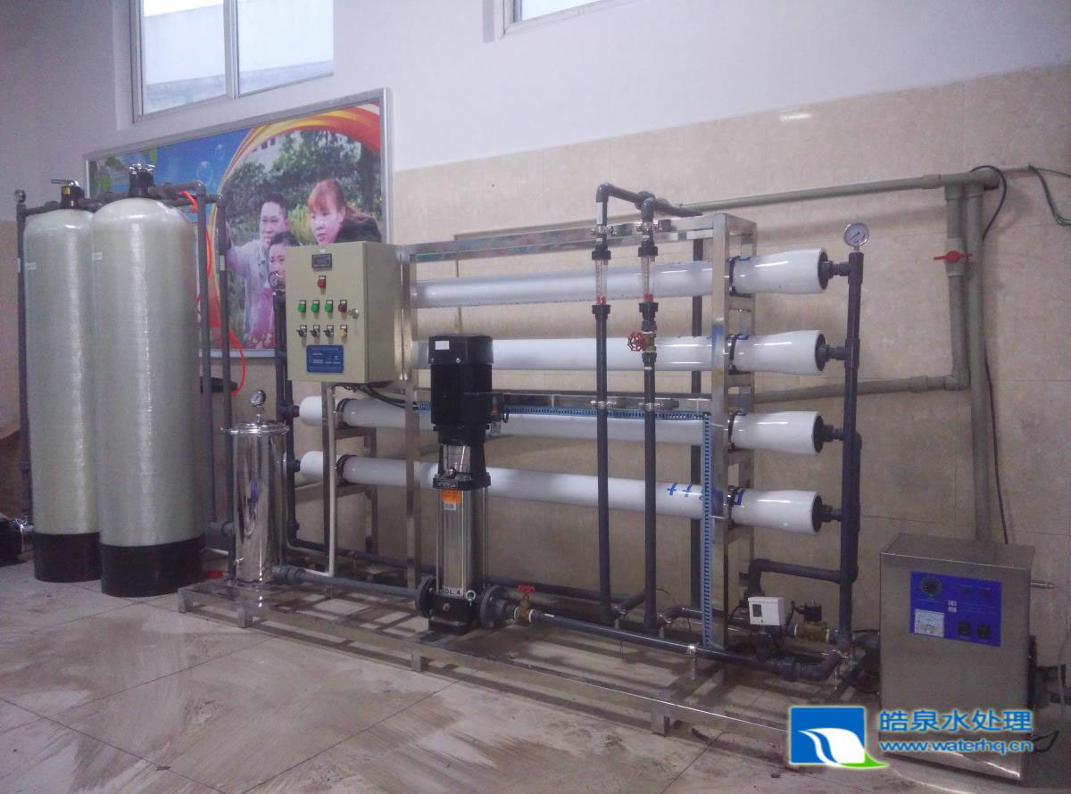 原水→原水泵→活性炭過(guò)濾器→軟化器→→保安過(guò)濾器→高壓泵→反滲透設(shè)備→純水箱→臭氧殺菌
