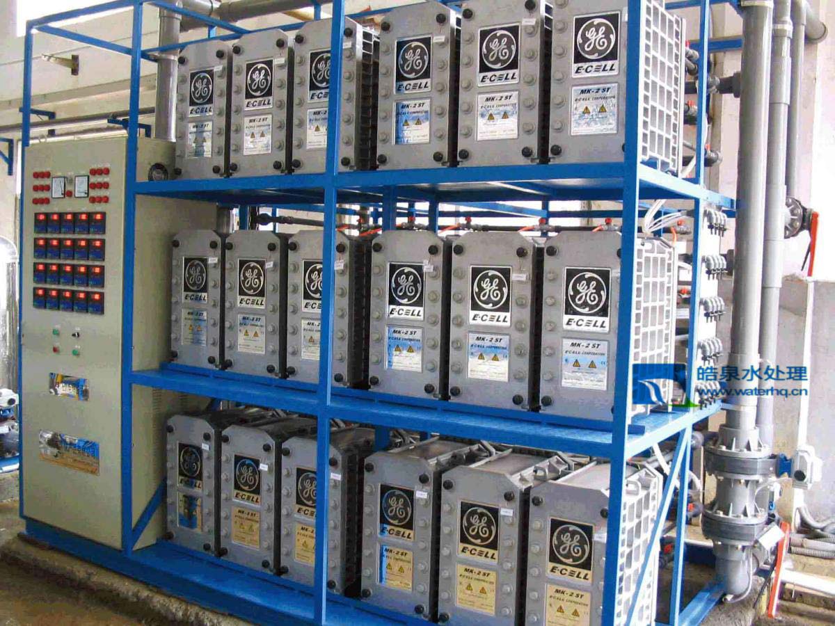 在位于模組兩端的陽(yáng)極(+)和陰極(-)之間加一直流電場(chǎng)。電勢(shì)就使交換到樹(shù)脂上的離子沿著樹(shù)脂粒的表面遷移并通過(guò)膜進(jìn)入濃水室。陽(yáng)極吸引負(fù)電離子(如OH,CI)這些離子通過(guò)陰離子膜進(jìn)入相臨的濃水流卻被陽(yáng)離子選擇膜阻隔,從而留在濃水流中。陰極吸引純水流中的陽(yáng)離子(如H,Na)。這些離子穿過(guò)陽(yáng)離子選擇膜,進(jìn)入相臨的濃水流卻被陰離子膜陰隔,從而留在濃水流中。當(dāng)水流過(guò)這兩種平行的室時(shí),離子在純水室被除去并在相臨的濃水流中聚積,然后由濃水流將其從模組中帶走。在純水及濃水中離子交換樹(shù)脂的使用是ElectropupreEDI技術(shù)和專(zhuān)利的關(guān)鍵。一個(gè)重要的現(xiàn)象在純水室的離子交換樹(shù)脂中發(fā)生。在電勢(shì)差高的局部區(qū)域,電化學(xué)反應(yīng)分解的水產(chǎn)生大量的H和OH。在混床離子交換樹(shù)脂中局部H和OH的產(chǎn)生使樹(shù)脂和膜不需要添加化學(xué)藥品就可以持續(xù)再生。